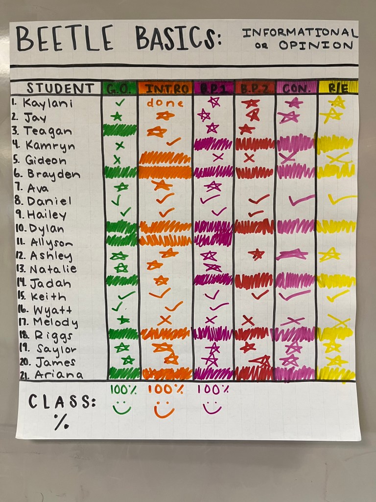 That is, until this year. I found the easiest solution that not only allows for me to see where my class is at, but it also allows each student to take ownership of where they are in the writing process. I made a different anchor chart for each piece of writing that we did throughout the school year. The chart included a row for each one of my students and a column for each step of the writing process. When students completed a step they got to and check that step off. When our entire class completed one step, let’s say everyone got their graphic organizer done, I then went and added 100% completion to that column. I went from having to look through more than 20 writing folders to see which of my students were, to simply looking at one anchor chart and clearly being able to check in with kids who needed more assistance. Let me know if you try this in your classroom!